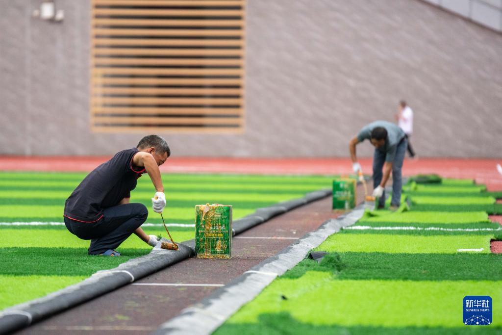 8月29日,在平江縣桂花學校,施工人員對操場的人造草坪進行修復。