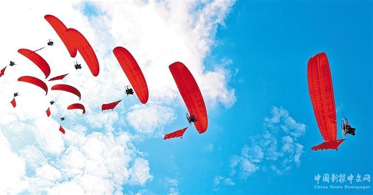 ?、?月27日,江西省贛州市南康區(qū)布谷寨體育公園國家航空飛行營地,迎國慶飛行表演在舉行,滑翔傘懸掛著的國旗迎風飄揚。朱海鵬攝(中經視覺)