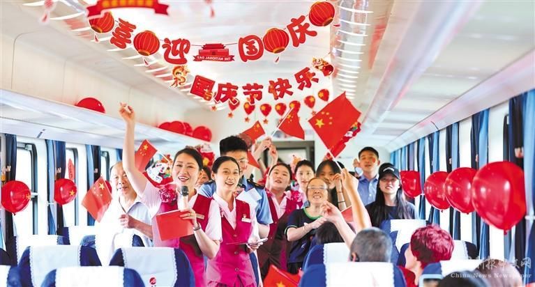?、?月30日,福州開往松溪的K8746次列車上,福州客運段福京車隊乘務員與旅客同聲合唱《我和我的祖國》。王旺旺攝(中經視覺)