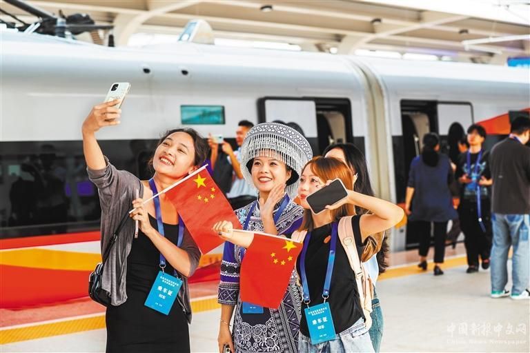 ?、?月29日,渝昆高鐵川渝段(重慶西至四川省宜賓站)開通運營,旅客手持國旗在站臺上留影。莊歌爾攝(中經視覺)