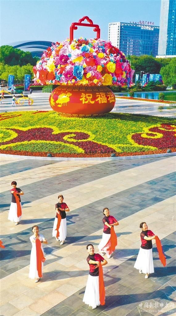 ?、?月29日,安徽省合肥市政務服務中心廣場,市民在國慶主題大花籃前載歌載舞,迎接國慶。陳三虎攝(中經視覺)