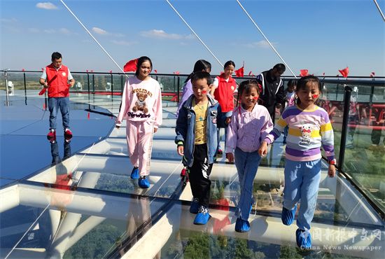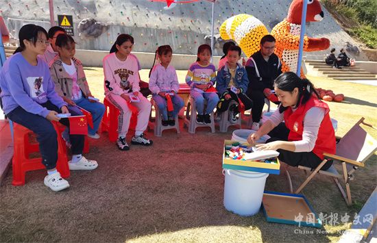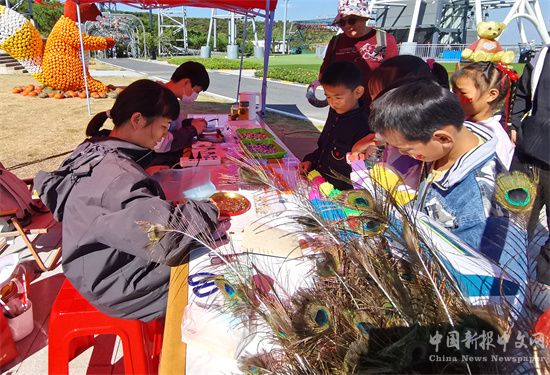 2024年10月4日,安徽省合肥市廬江縣白山鎮(zhèn)10余名留守兒童,在當(dāng)?shù)匾患疑鐣?huì)服務(wù)組織的引領(lǐng)下,體驗(yàn)高空玻璃棧道、觀賞孔雀、學(xué)習(xí)用孔雀羽毛制作掛件、學(xué)習(xí)非遺項(xiàng)目漆畫等,小朋友們快樂(lè)度過(guò)國(guó)慶假日一天。(巢志斌 攝)