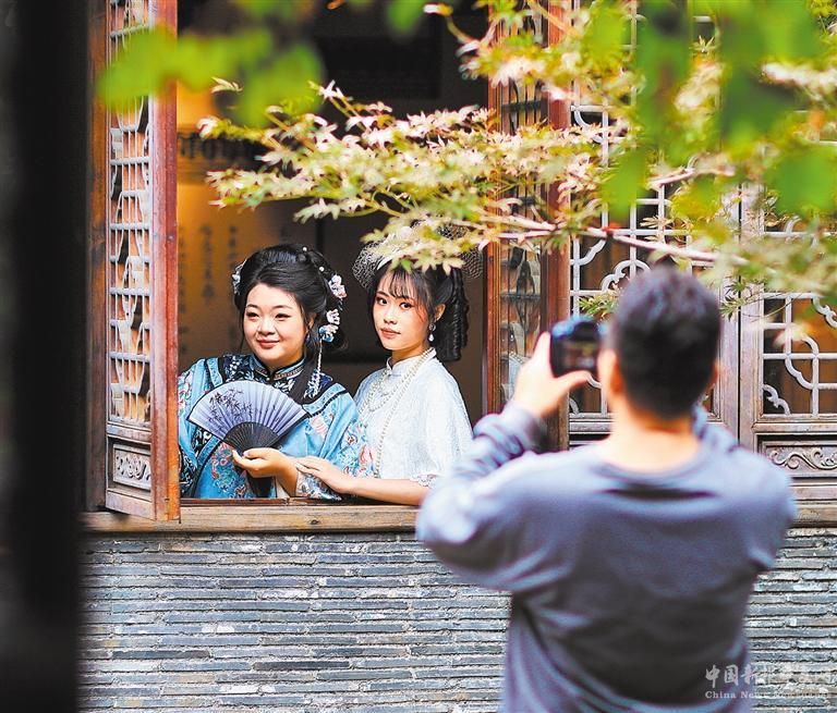 10月6日,游客在江蘇省南京市老門東景區(qū)體驗(yàn)旅拍。蘇 陽攝(中經(jīng)視覺)