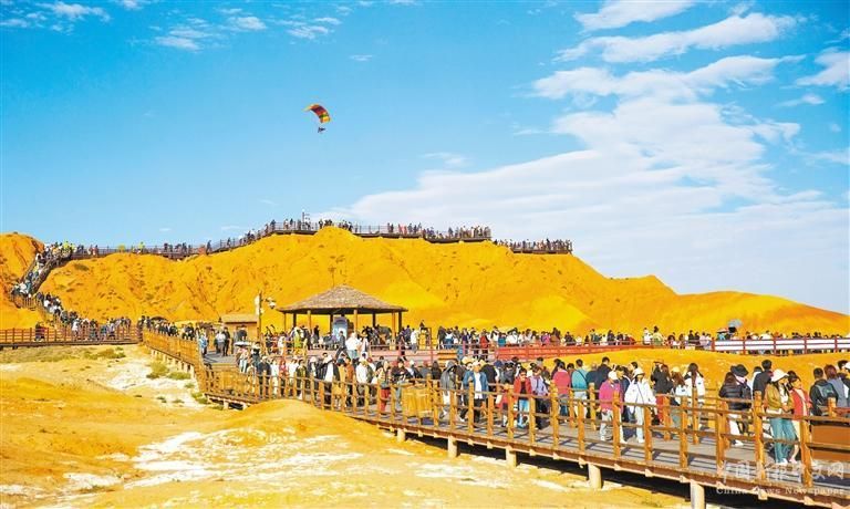 10月3日,甘肅省張掖七彩丹霞景區(qū),游客乘坐動(dòng)力滑翔傘游覽。近年來,當(dāng)?shù)卮罅ν苿?dòng)“低空經(jīng)濟(jì)”發(fā)展,打造低空旅游新品牌。楊 瀟攝(中經(jīng)視覺)