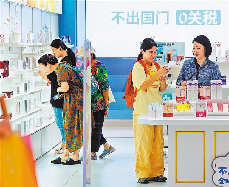 ②9月25日,游客在位于解放碑步行街的陸海新通道國際消費中心選購商品。這是西部首個核心商圈保稅展示交易中心。