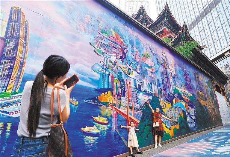 ⑤9月24日,游客在解放碑妙街拍照打卡。解放碑商圈以地標IP、文化藝術(shù)為亮點,打造多元特色、引領(lǐng)時尚的消費場景。
