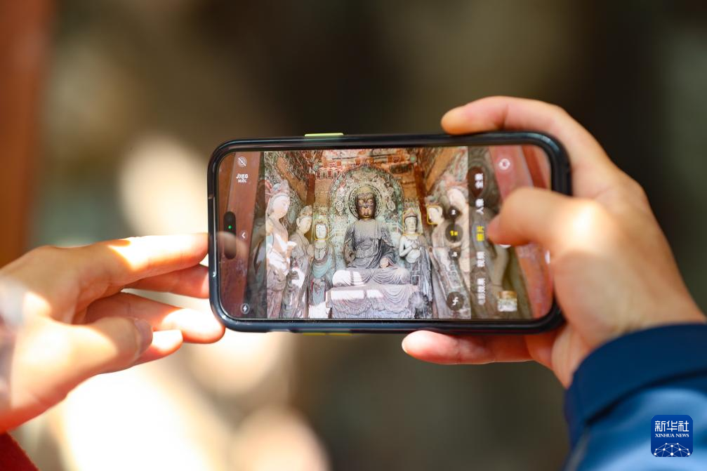 11月2日,游客在麥積山石窟參觀游覽時用手機(jī)拍攝開放洞窟彩塑。