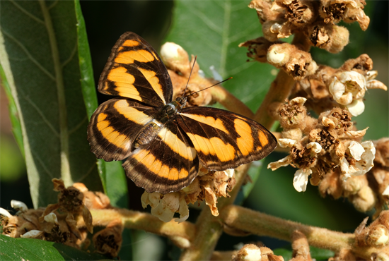 眼下雖是立冬前后,在天寶巖保護(hù)區(qū),卻常有晴好天氣,開花的枇杷樹、溫暖潮濕的溪澗沙灘,經(jīng)常吸引相思帶蛺蝶、娜拉波灰蝶等蝴蝶紛至沓來。此次監(jiān)測到的相思帶蛺蝶為漂亮的雌蝶,翅背面褐色,斑紋為橙黃色,前翅中室斑有鋸齒紋。一年多代,成蟲多見于5月至11月。娜拉波灰蝶系小型灰蝶,腹面擁有多組兩側(cè)鑲白線的暗紋列,后翅具絲狀尾突,后翅近臀角呈黑色鑲橙邊眼紋,外側(cè)自帶金屬藍(lán)色鱗片。