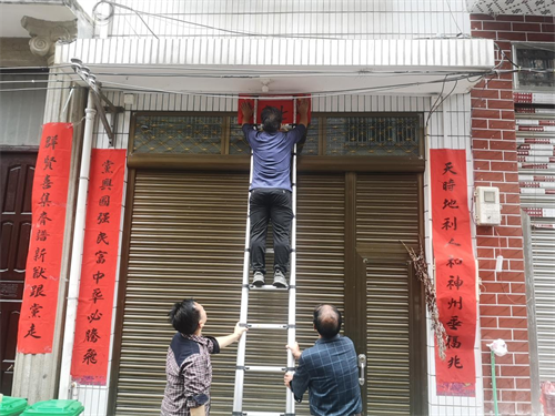 洞口縣高沙鎮(zhèn)文聯(lián)會(huì)員在居民家大門(mén)口貼對(duì)聯(lián)。劉大華(攝)
