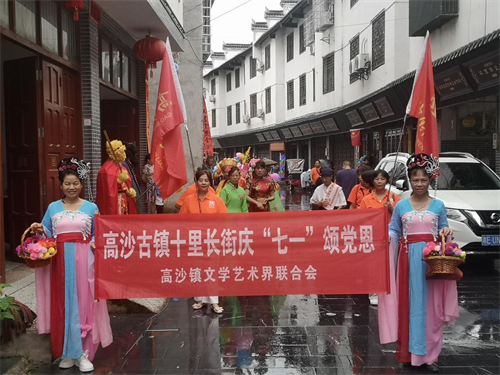 7月1日上午,高沙鎮(zhèn)文聯(lián)組織100名會(huì)員統(tǒng)一著裝,手拿小紅旗,舉著橫幅等走上鎮(zhèn)主要街道游行宣傳。游行隊(duì)伍所到之處深深吸引了街道倆邊居民,過(guò)往群眾抬頭、駐足觀賞及熱情鼓掌。街道不同地點(diǎn)的文藝表演緊緊抓?。浩咭?ldquo;慶黨節(jié),頌黨恩內(nèi)容,歌舞表演《梨花頌》、《唱支山歌給黨聽(tīng)》,抒發(fā)愛(ài)國(guó)情懷的詩(shī)朗誦《鶯啼序·長(zhǎng)江》和充滿(mǎn)回憶的男聲小組唱《喀秋莎》等,把游行活動(dòng)推向了高潮。