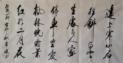 第二,注重內(nèi)容與形式的完美統(tǒng)一。在欣賞常斌先生的書法作品過程中,從中可以看出他復(fù)雜曲折的心理變化,感悟到他積極向上的人生態(tài)度和從容大度,以及他對(duì)生活的熱愛和對(duì)人生的理解。有人評(píng)論他“書如其人,儒雅、謙和、端莊和俊逸”,就是對(duì)他書品的高度概括。常斌的書法作品,不僅書寫認(rèn)真,起筆落筆迂回有力,一筆一劃富有骨感,充滿著激情和追求,以及對(duì)未來生活的期待。在書法形式方面布局合理,字距行距都十分考究。無論是何種字體,都能根據(jù)字體的大小和用墨的輕重,將所書寫的內(nèi)容恰當(dāng)?shù)臄[布在最佳的位置之中,無論是從何種角度,也無論是遠(yuǎn)看近視,都有很強(qiáng)的藝術(shù)性和書法的美感。
