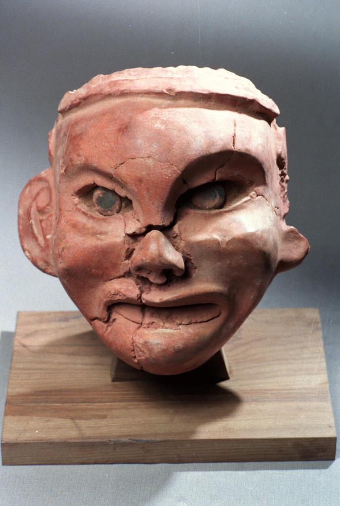 1983年10月,考古工作者在牛河梁遺址女神廟主室西側(cè)群像殘體中,首次發(fā)現(xiàn)一個較完整的接近真人大小的彩塑女神頭像,其眼珠是用綠色磨圓玉片鑲嵌而成,右下圖為女神左手。