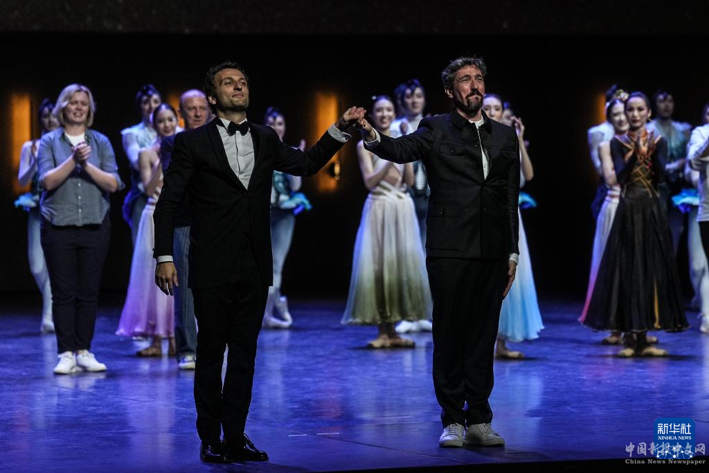 8月10日,法國(guó)編導(dǎo)馬探·釃(右)和指揮維克多·雅各布向觀眾致謝。