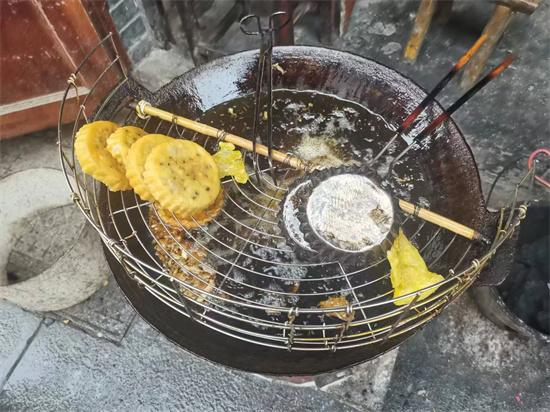 而那邊沿有著齒輪形狀的模型,猶如一位忠實(shí)的伙伴,見(jiàn)證了無(wú)數(shù)次美味的誕生。將調(diào)好的食材小心翼翼地舀入瓢中,再輕輕倒入滾燙的油鍋里。剎那間,“滋滋”作響,油花四濺,仿佛是一場(chǎng)歡快的舞蹈。約三分鐘左右,神奇的變化發(fā)生了,原本平淡的食材逐漸變得金黃酥脆,香氣四溢。