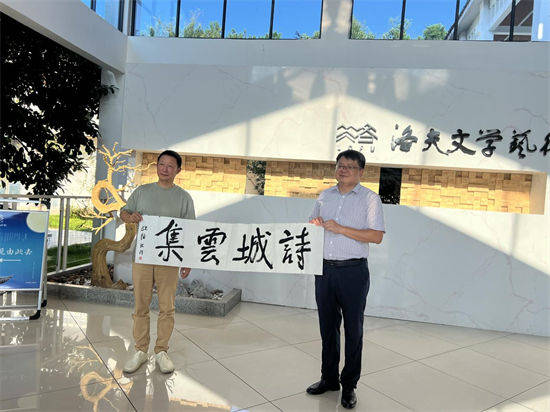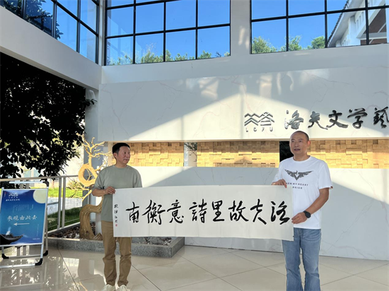 當(dāng)天下午,歐陽江河與詩人胡丘陵、陳群洲,衡陽師院文學(xué)院院長任美衡,副縣長胡庚燦,縣發(fā)展集團黨委委員、副總經(jīng)理劉靜,縣文旅發(fā)展公司總經(jīng)理寧朝暉及眾多詩歌愛好者、文化界人士齊聚一堂,共同探討了怎樣利用洛夫IP,賦能衡南文旅發(fā)展。他說,洛夫是當(dāng)代最重要的代表性詩人,這是衡南無比寶貴的文化資源,值得大力挖掘、打造和推廣?;顒右潦?,歐陽江河參觀了洛夫文學(xué)藝術(shù)館,對館內(nèi)豐富的藏品和深厚的文化底蘊表示了由衷的贊賞,對洛夫的成名作《石室之死亡》更是稱贊不已,說這是鎮(zhèn)館的無價之寶。隨后舉行的交流筆會,歐陽江河老師揮毫潑墨,題寫了“洛夫故里,詩意衡南”“詩城云集”等寄語,表達了對衡南文旅發(fā)展的美好祝愿。