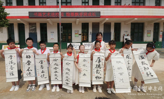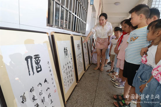 2024年9月6日,在湖南省漣源市橋頭河鎮(zhèn)歸盤園學(xué)校,孩子們在老師的帶領(lǐng)下欣賞書畫作品,增進(jìn)學(xué)生美學(xué)認(rèn)知,增強(qiáng)文化自信。