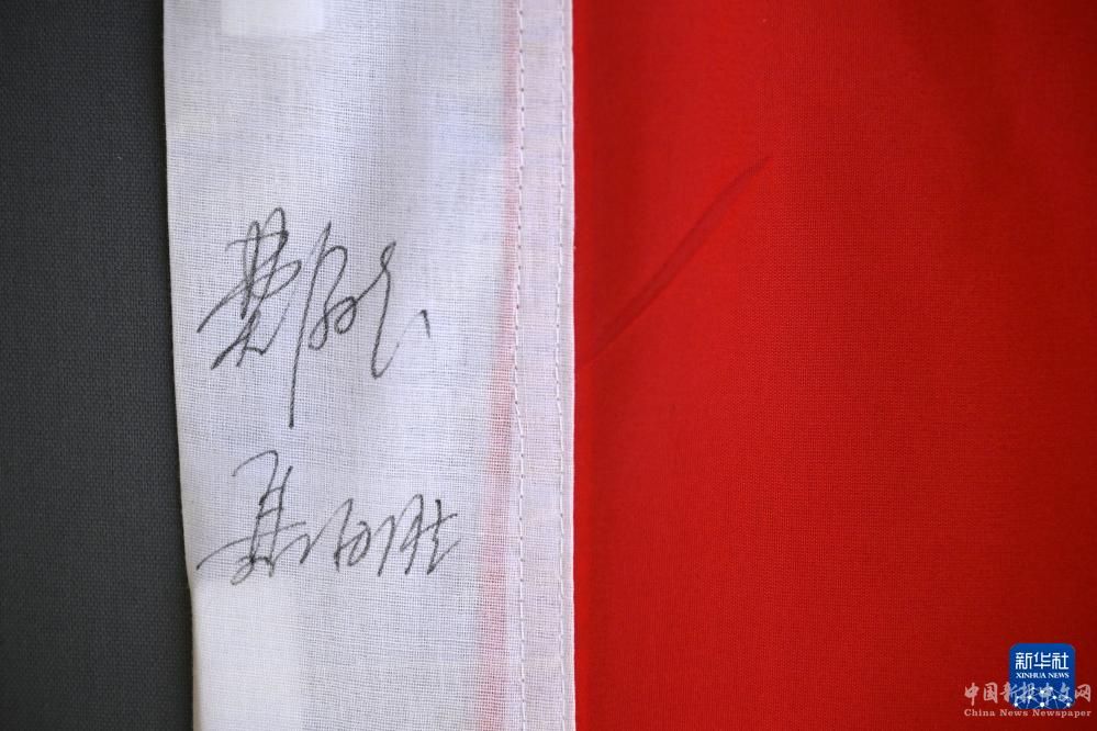 9月29日在展覽上拍攝的航天員費(fèi)俊龍、聶海勝在搭乘“神舟”六號載人飛船飛行時(shí)展示的國旗上的簽名。