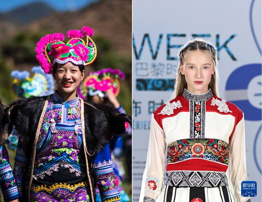 這是一張拼版照片:左圖為2019年2月19日拍攝的一名年輕女孩在楚雄彝族自治州永仁縣直苴村參加賽裝節(jié)(新華社記者 江文耀 攝);右圖為2024年9月26日拍攝的模特在法國(guó)巴黎舉行的中國(guó)楚雄非遺服飾時(shí)裝展上展示時(shí)裝(新華社記者 高靜 攝)。