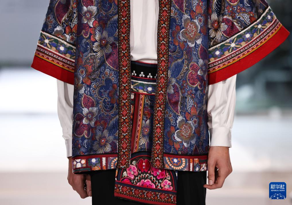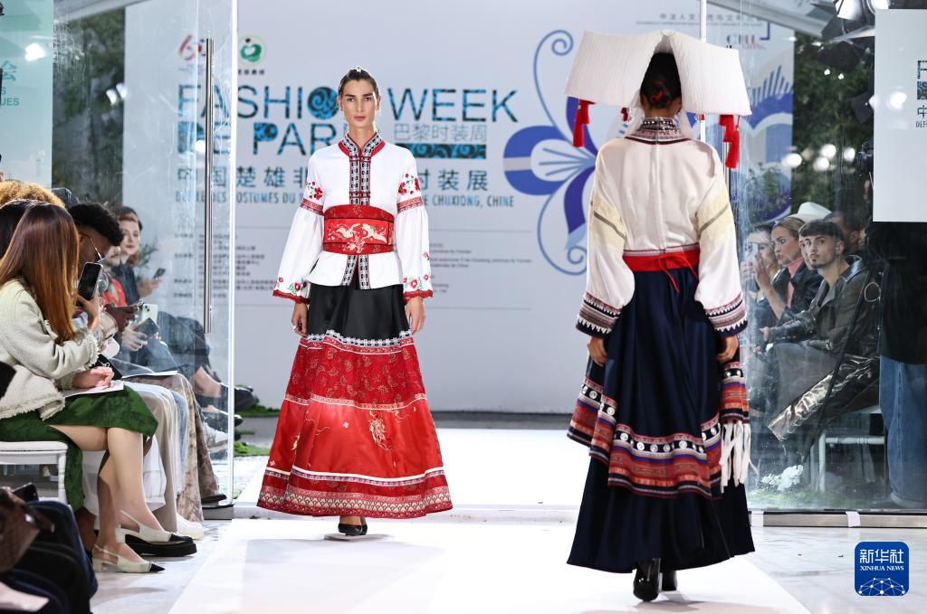 9月26日,模特在法國(guó)巴黎舉行的中國(guó)楚雄非遺服飾時(shí)裝展上展示時(shí)裝。