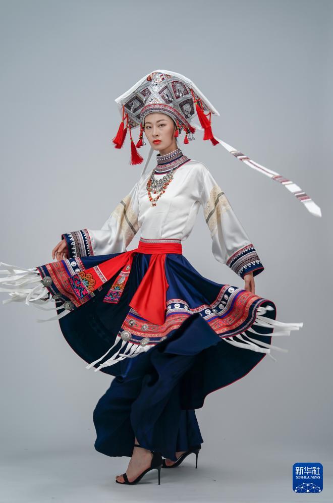 8月27日,在昆明一處攝影棚內(nèi),云南藝術(shù)學(xué)院設(shè)計(jì)學(xué)院服裝與服飾設(shè)計(jì)系教師范佳展示一件將赴巴黎參展的彝繡服裝。范佳是參展彝族服飾作品的設(shè)計(jì)師之一。