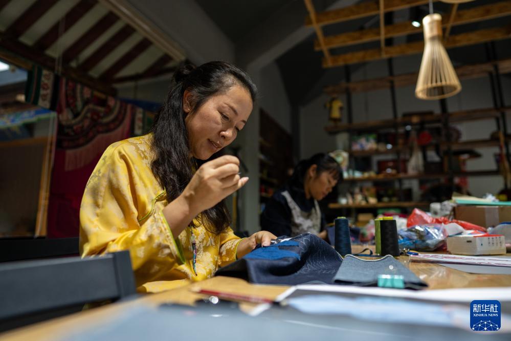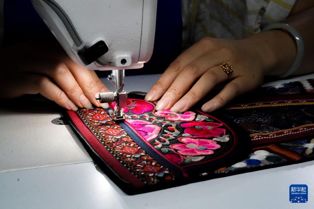 9月7日,國(guó)家級(jí)非物質(zhì)文化遺產(chǎn)代表性項(xiàng)目彝族服飾州級(jí)代表性傳承人盧潔瑩在自己云南楚雄的工作室內(nèi)制作繡品。盧潔瑩是赴巴黎參展彝族服飾作品的設(shè)計(jì)師之一。