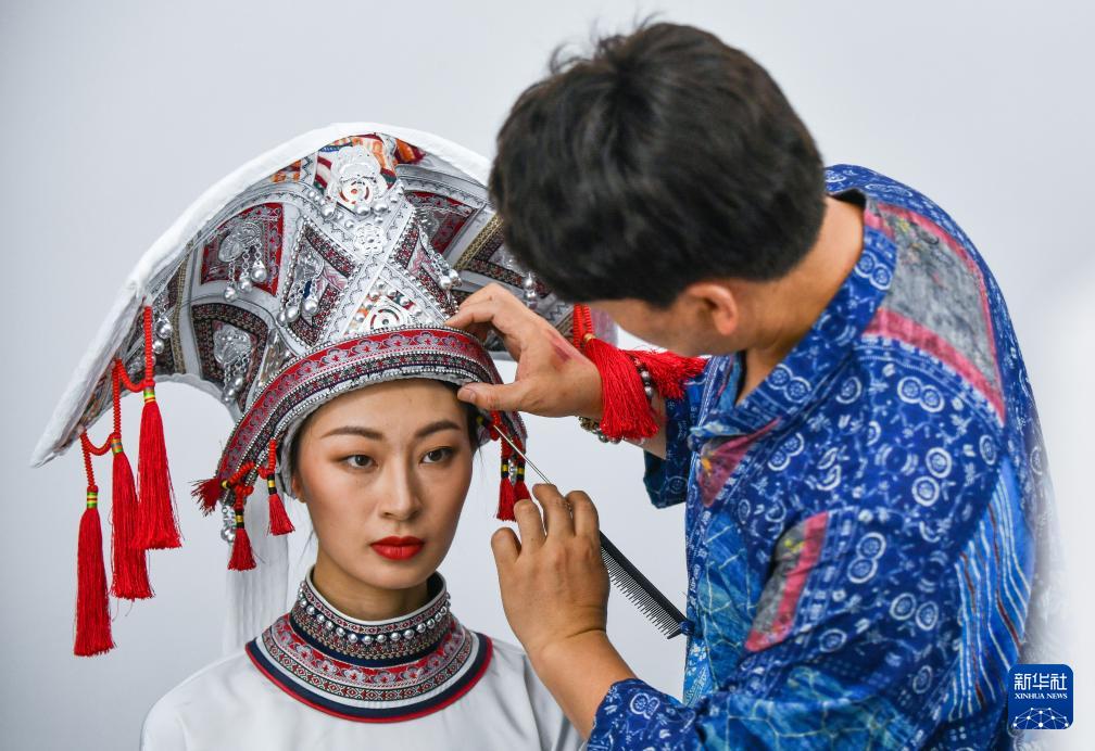 8月27日,在昆明一處攝影棚內(nèi),一名穿著參展服飾的模特(左)拍攝定妝照前整理頭飾。