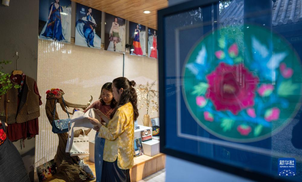 9月7日,國(guó)家級(jí)非物質(zhì)文化遺產(chǎn)代表性項(xiàng)目彝族服飾州級(jí)代表性傳承人盧潔瑩(右)在自己云南楚雄的工作室內(nèi)向訪客介紹彝繡服飾。盧潔瑩是赴巴黎參展彝族服飾作品的設(shè)計(jì)師之一。