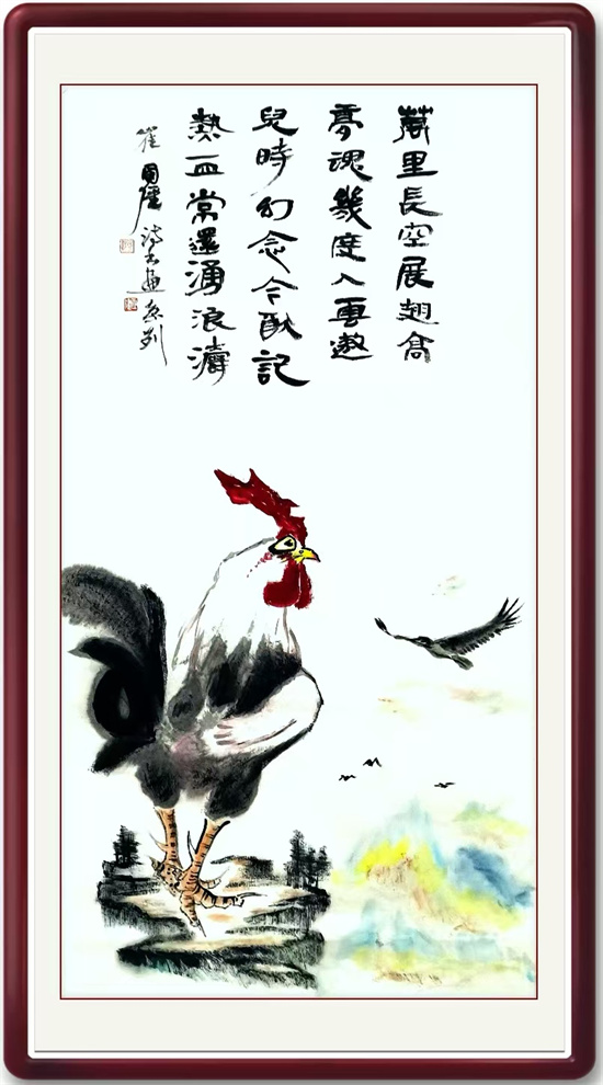 在其詩(shī)書畫系列中,以詩(shī)豐富畫面,以畫映襯詩(shī)篇,形成一種相互呼應(yīng)、相得益彰的藝術(shù)效果。觀其最近第 472 期的詩(shī)書畫,畫中雄雞昂首屹立于山石之上,目光緊盯著一只凌空翱翔的雄鷹,作者忽有感于少年的夢(mèng)想,感嘆歲月匆匆,不堪回首,如今只能偶爾“老夫聊發(fā)少年狂”,熱血涌動(dòng),于是揮筆寫下: