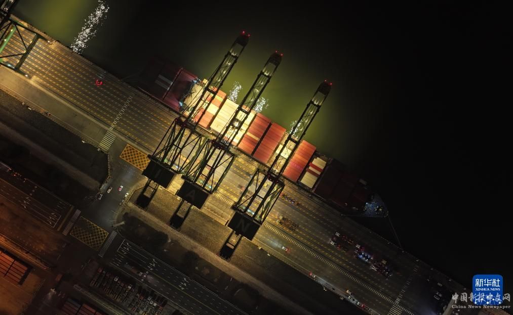 1月16日,大型集裝箱班輪“巴赫”號(hào)靠泊在天津港太平洋國(guó)際集裝箱碼頭(無(wú)人機(jī)照片)。新華社記者 趙子碩 攝