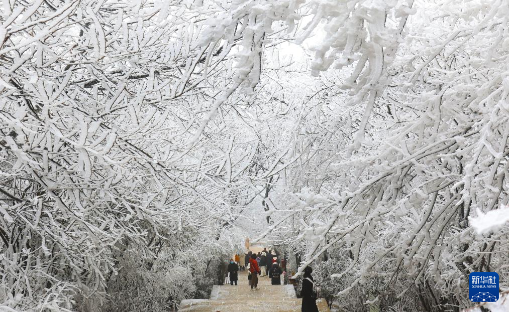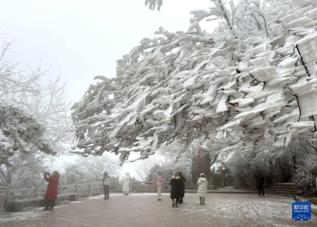 1月19日,游人在江蘇連云港市花果山玉女峰觀賞霧凇。