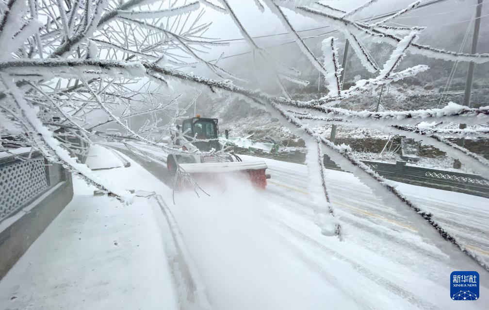 1月19日,在241國道湖北省??悼h后坪鎮(zhèn)紅巖寺路段,公路養(yǎng)護(hù)工人在進(jìn)行除雪作業(yè)。