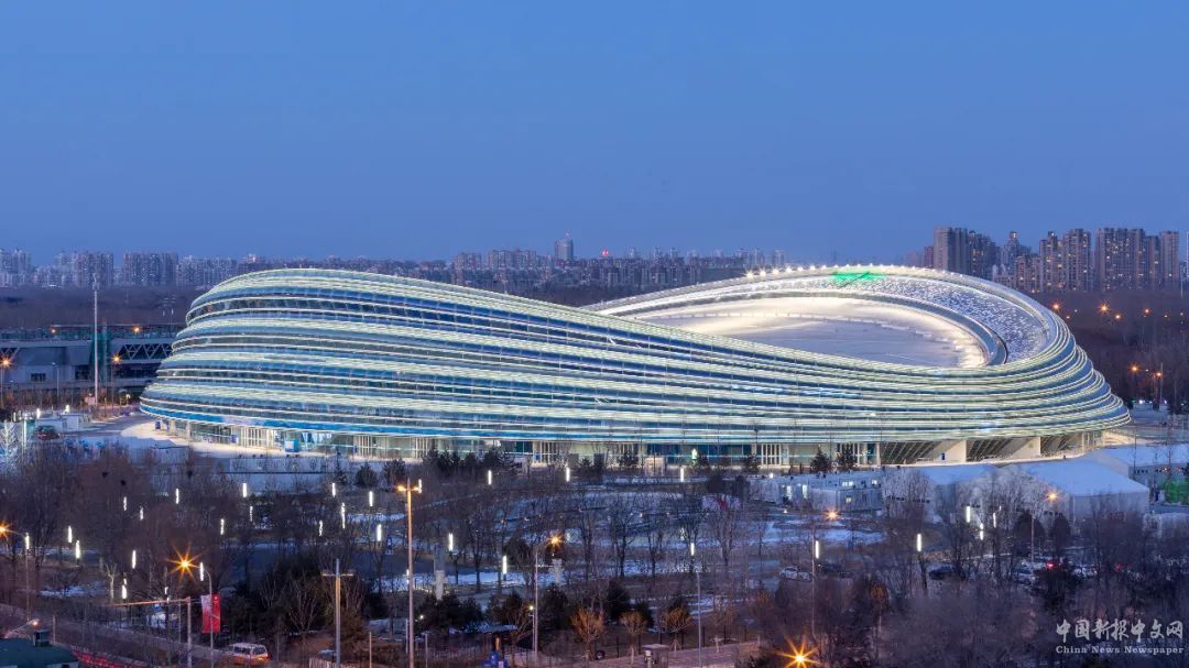 沿北京中軸線一路向北,空中俯瞰,國家速滑館宛若冰刀在冰面上刻下的晶瑩軌跡。它的另一個名稱“冰絲帶”,由此得名。