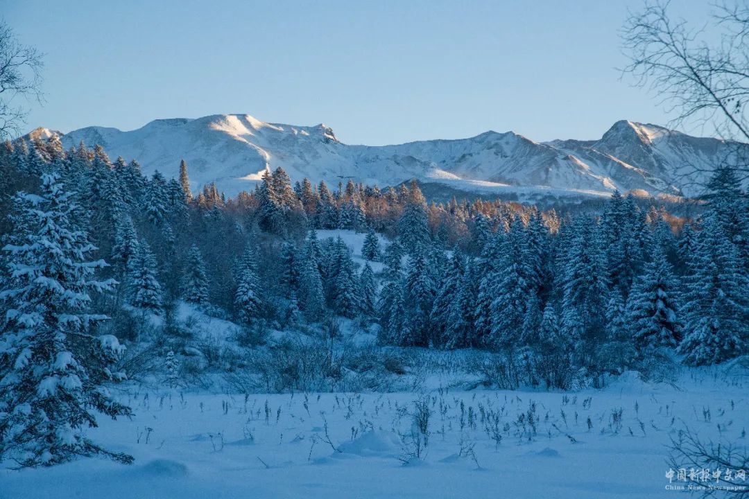 △2023年12月17日,吉林撫松縣松江河鎮(zhèn),長白山西坡為大雪覆蓋,景色如畫。