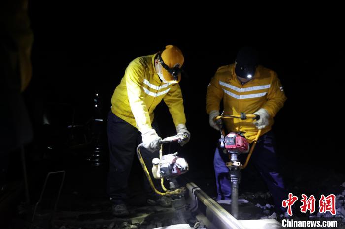 20時左右,到達作業(yè)地點。大家拎著起道機、搗固棒、螺絲機上線忙活起來。有人松螺母,有人搖動起道機臂抬升鋼軌枕木,有人用搗固棒夯實石砟,一時間,螺絲機、搗固棒發(fā)出的轟鳴聲,散出的油煙,讓有限空間變得嘈雜、刺耳。鄧佳興拿著軌距尺復(fù)核鋼軌幾何尺寸,在枕木上熟練地寫下“+1、-1,0、-1……”幾組數(shù)字。像這樣的流程,他們在“天窗”時間,還要在不同處所重復(fù)八次。