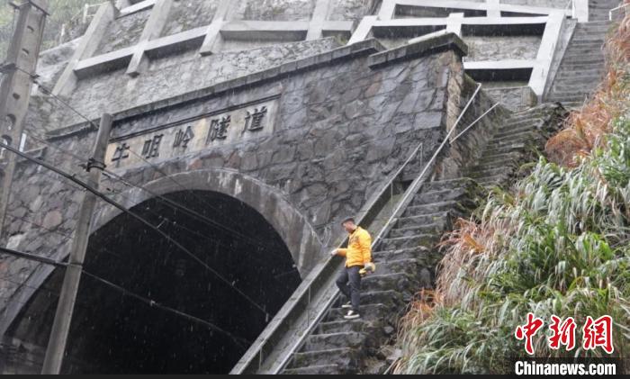 迎著雨雪差不多走了十分鐘才抵達目的地。鄧佳興鼻子凍得通紅,頭發(fā)上落了一層雪,仔細檢查了應(yīng)急備品,又頂著雨雪攀登而上。他說:“前段時間,這里有處鋼軌焊縫核傷需要加固,我拎著20斤重的鼓包夾板,兩分鐘就跑下來了。今天臺階濕滑,比平時走得更慢。”