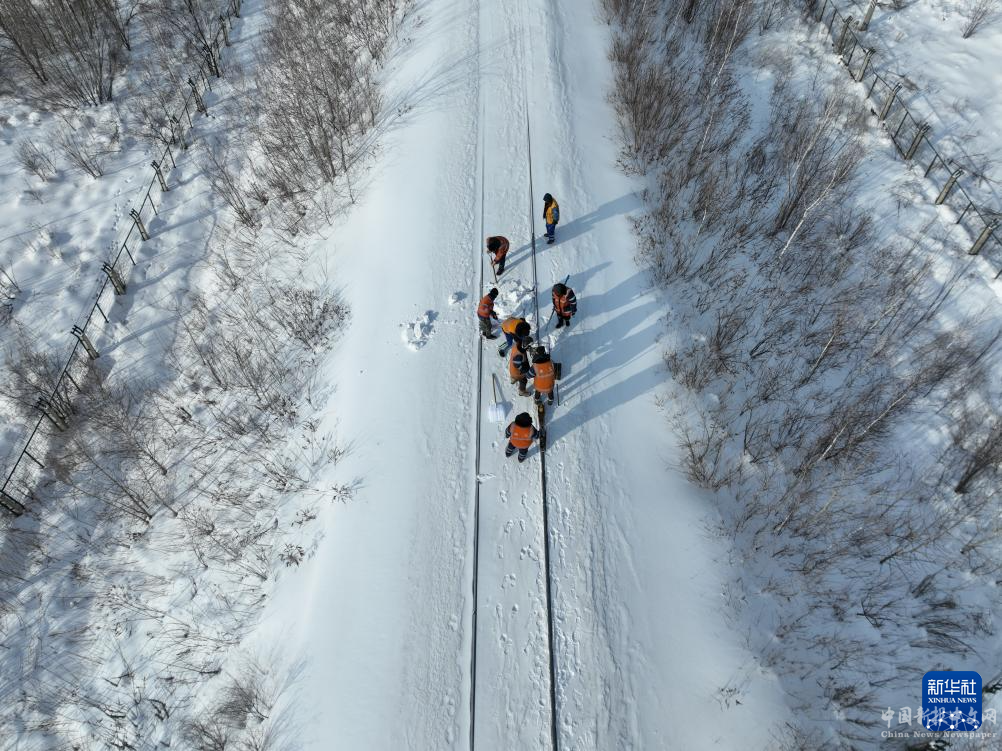1月24日,在撫遠(yuǎn)站附近,中國(guó)鐵路哈爾濱局集團(tuán)有限公司佳木斯工務(wù)段前進(jìn)鎮(zhèn)線路車間撫遠(yuǎn)工區(qū)班組成員進(jìn)行冬季線路凍害檢修作業(yè)(無(wú)人機(jī)拍攝)。