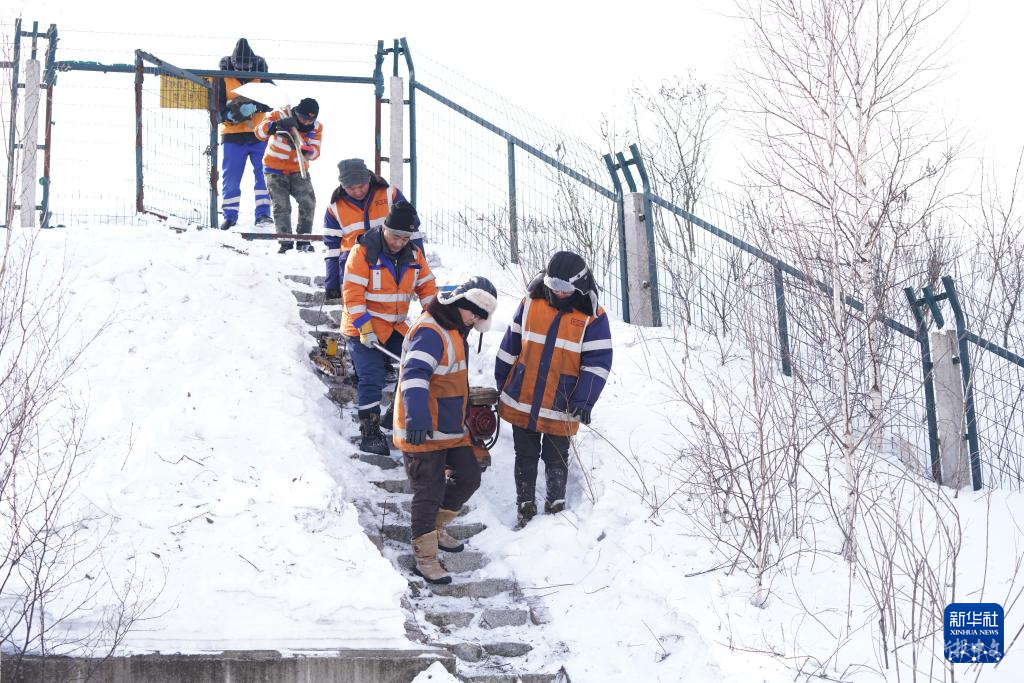 1月23日,在撫遠(yuǎn)站附近,中國(guó)鐵路哈爾濱局集團(tuán)有限公司佳木斯工務(wù)段前進(jìn)鎮(zhèn)線路車間撫遠(yuǎn)工區(qū)班組成員進(jìn)行冬季線路凍害檢修作業(yè)。