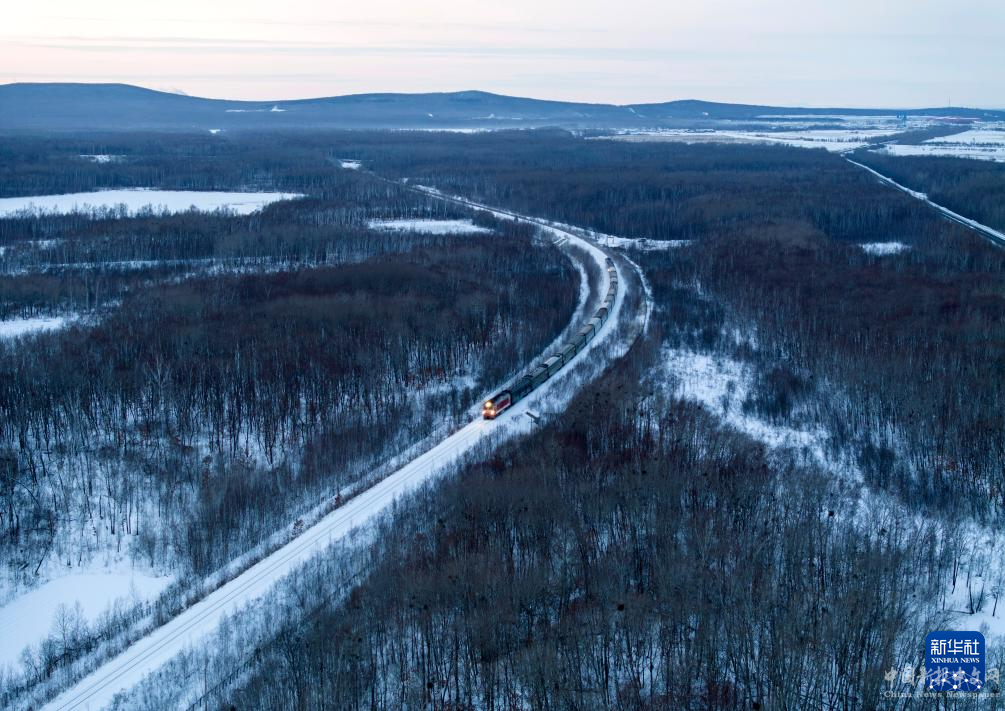 1月23日拍攝的列車即將抵達(dá)撫遠(yuǎn)站(無(wú)人機(jī)照片)。