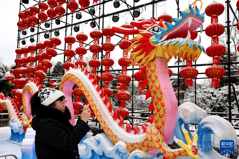 2月1日,在山東省棗莊市人民公園,市民用手機(jī)拍攝雪景。