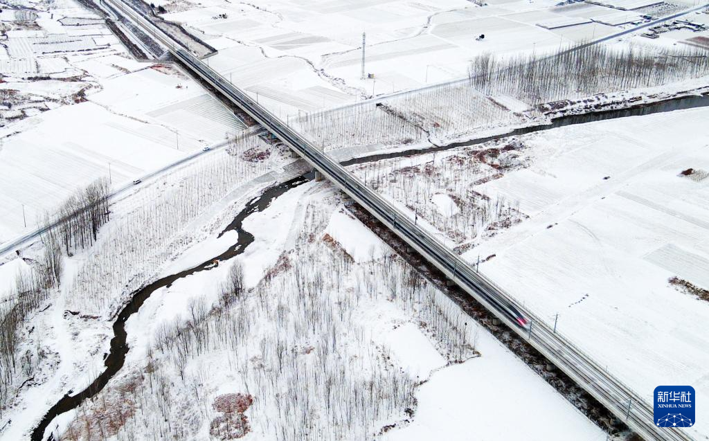 2月1日,一列動車組列車行駛在山東省臨沂市平邑縣境內(nèi)(無人機(jī)照片)。