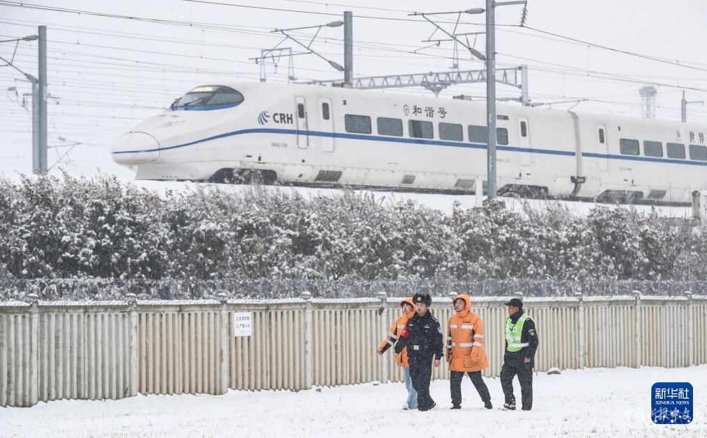 2月4日,鐵路公安民警和高鐵基礎(chǔ)設(shè)施線路工在江蘇淮安東站線路段巡查。