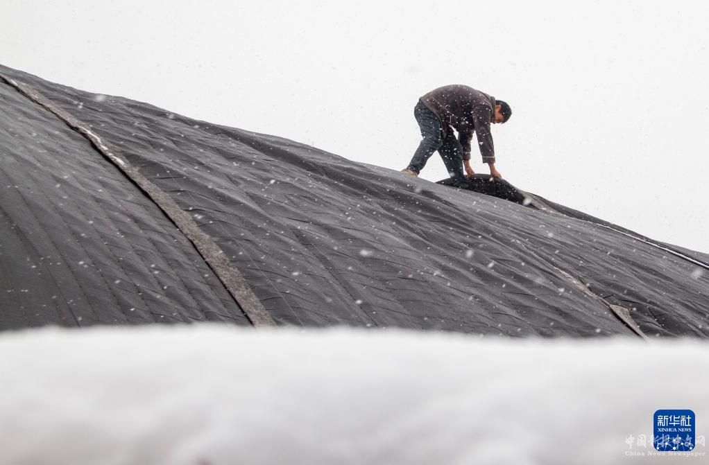 2月4日,在河南省夏邑縣會(huì)亭鎮(zhèn)朱瓦房村,村民冒雪加固育苗大棚。