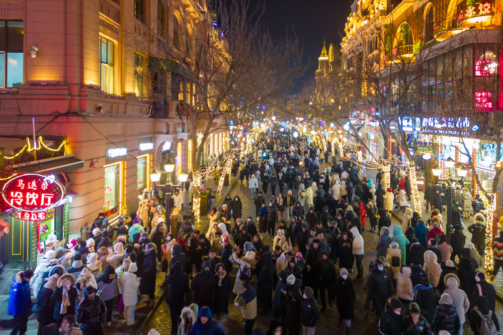 2024年1月9日,游客在哈爾濱百年老街中央大街上游玩(無(wú)人機(jī)照片)。新華社記者 張濤 攝