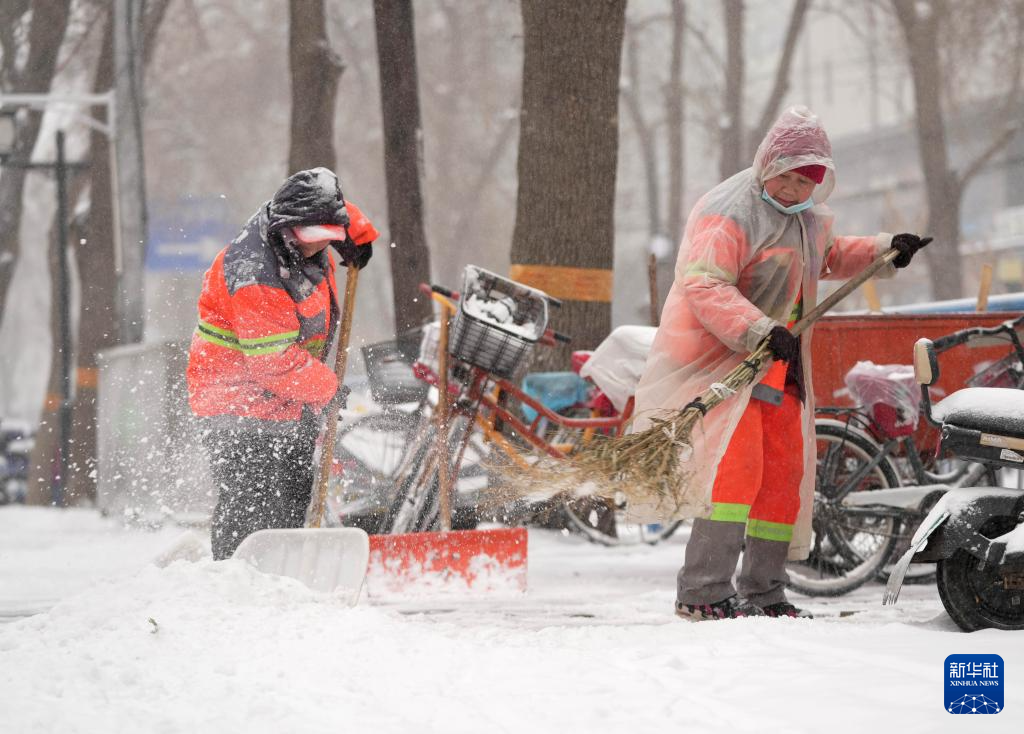 2月20日,環(huán)衛(wèi)工人在河北省石家莊市中山路清掃積雪。