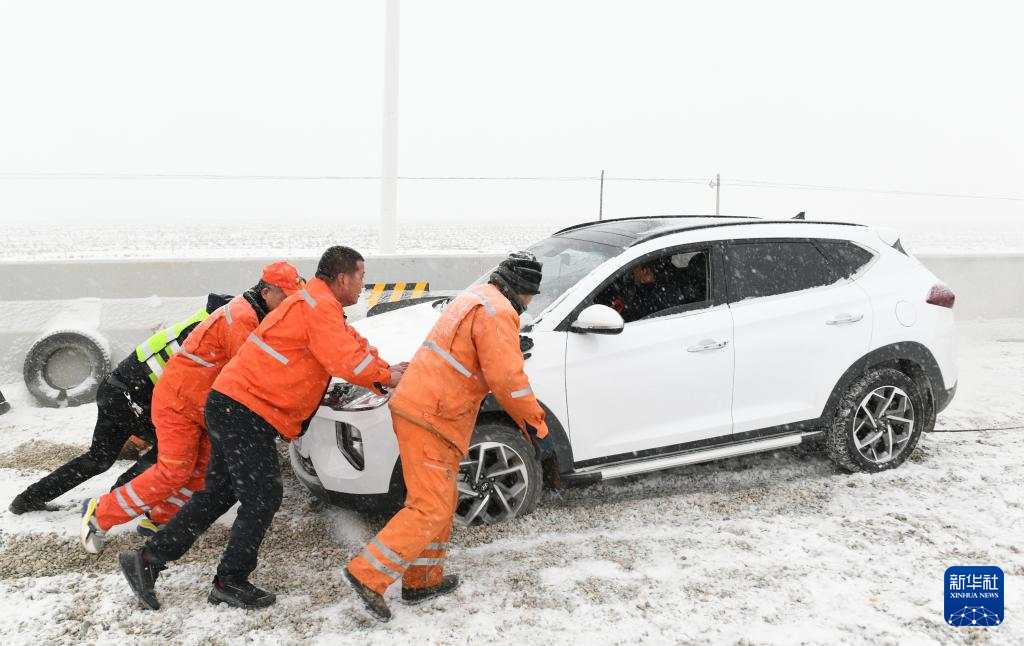 2月20日,在山東省青島市城陽區(qū),市民幫助受困車輛脫困。
