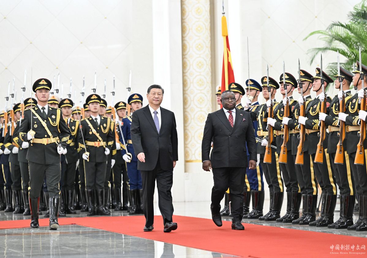 會(huì)談前,習(xí)近平和夫人彭麗媛在人民大會(huì)堂北大廳為比奧和夫人法蒂瑪舉行歡迎儀式。