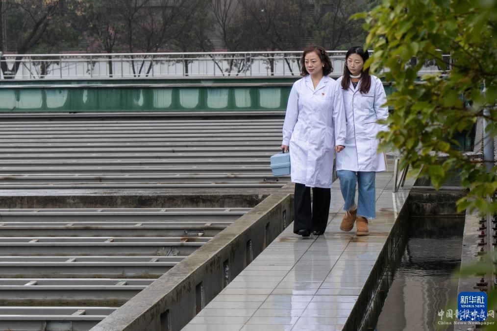 王瓊(左)與同事在武漢宗關(guān)水廠沉淀池上觀察水質(zhì)情況(2月20日攝)。