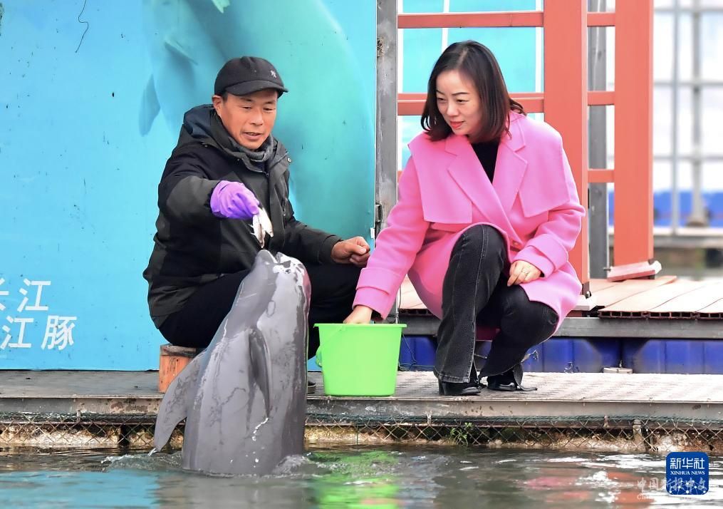 王瓊(左一)與來自武漢市農(nóng)業(yè)農(nóng)村局、武漢市禁捕辦以及武漢養(yǎng)殖企業(yè)的相關(guān)人員一同來到位于湖北省石首市的天鵝洲白鱀豚國家級自然保護(hù)區(qū),為長江江豚送來“過冬口糧”(2023年12月28日攝)。