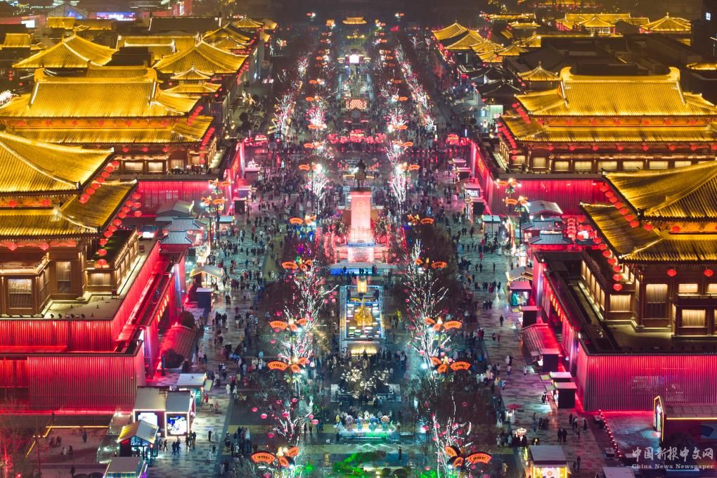 這是2024年2月2日拍攝的西安大唐不夜城景色(無人機(jī)照片)。新華社記者邵瑞攝