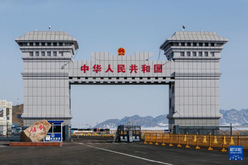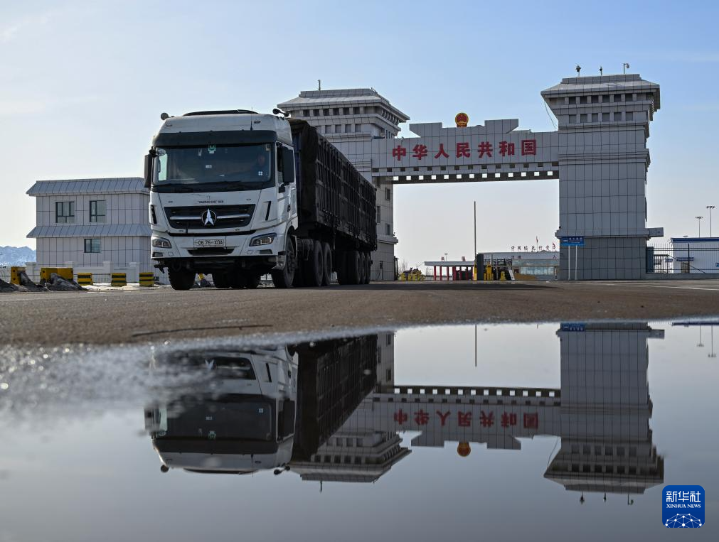 3月13日,在新疆塔克什肯口岸,運(yùn)輸車輛通過國門。